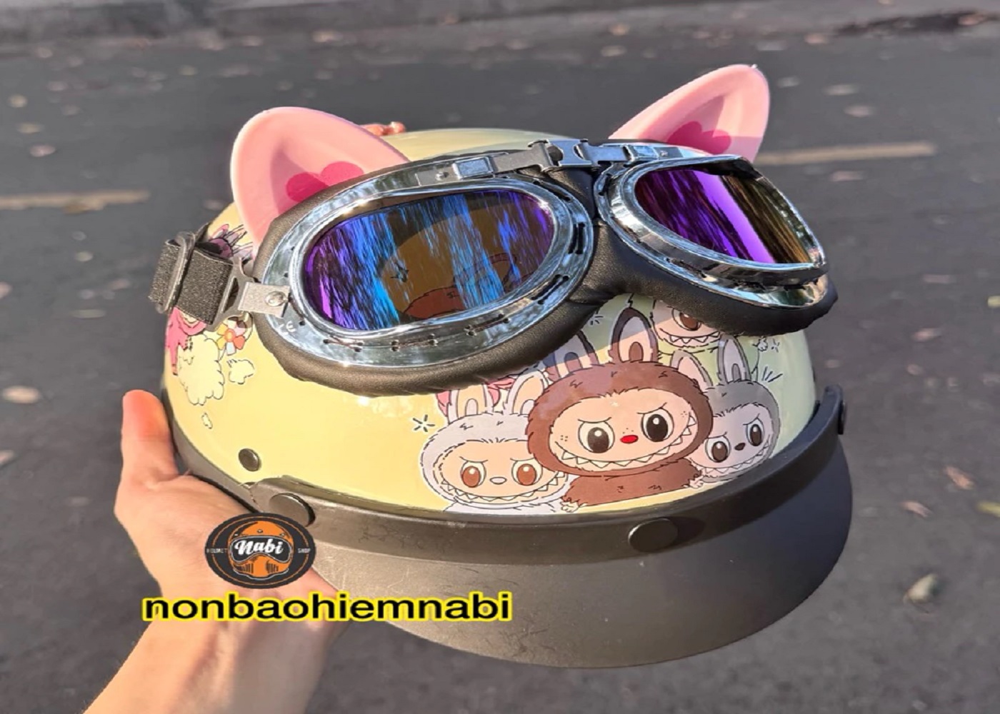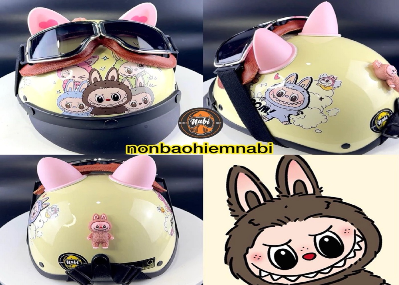Mũ bảo hiểm Labubu Kính Da siêu dễ thương , mũ bảo hiểm kính phi công Labubu nữa đầu.